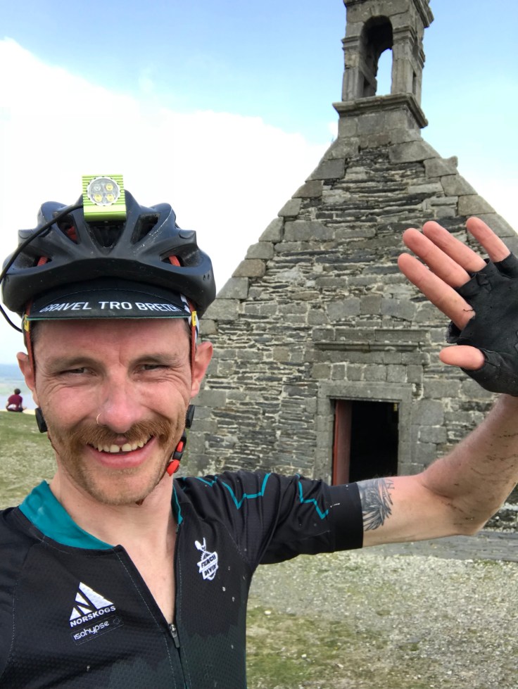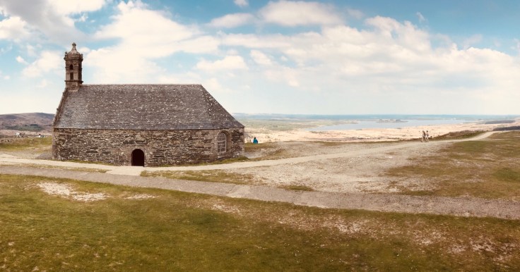 Nous arrivons au CP, une boulangerie, parfait, comme à chaque fois dans ce cas là, nous achetons tout-ce-qui-nous-tombe-sous-la-main. Le bilan de cette demi-journée est positif, nous avançons à bon rythme même si le dénivelé est bien présent. Le corps commence déjà à prendre le rythme, je verrais comment se passe l’après-midi. Le début d’après-midi se composera de l’ascension du Menez Mikel, le point culminant de la trace. Nous l’abordons de loin, il commence à se montrer lorsque nous sommes dans un paysage de landes et de tourbières, sans le soleil cela aurait pu être en Ecosse. Le Menez se grimpe par un chemin ponctué de grosses flaques, la transmission souffre mais ça avance. Nous atteignons le sommet et sa fameuse chapelle. Un groupe de randonneurs chante « Pelot d’Hebennont » il n’y pas de doute, nous somme bien en Bretagne. Un selfie de contrôle, un peu d’huile et c’est reparti.