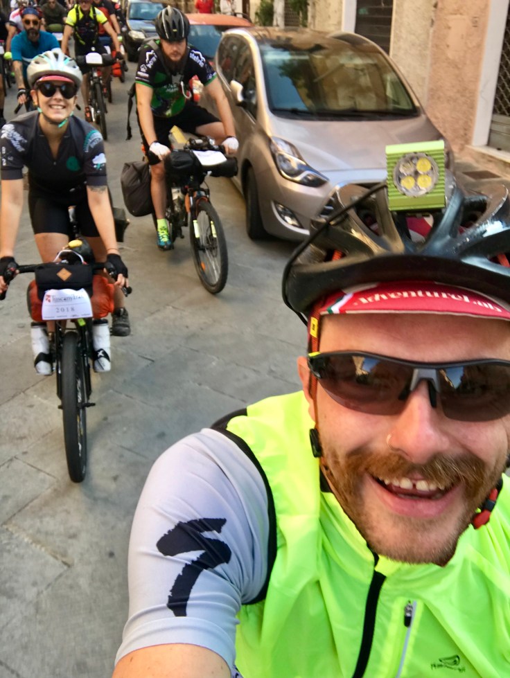 Le réveil est tranquille et nous nous mettons en route tranquillement vers le départ après un petit-déjeuner au soleil. Le départ est sur la place de la ville à quelques distance du stade, il y a 750 participants, nous suivons un train de cyclistes sans suivre le GPS, arrivés sur place, les cyclistes se massent, la pression monte, mais pas d’organisateur en vue. 5-10 min avant le départ nous voyons Andrea avec un mégaphone qui nous indique que nous ne sommes pas sur la bonne place. Et là c’est la cohue, nous rejoignons rapidement la bonne place et le départ est donné dans un joyeux bordel.