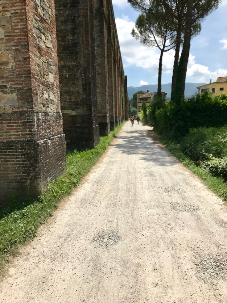 La suite de l’après-midi se fera sur les Strade Bianche, ses pistes blanches parfois bordées des cyprès caractéristiques des paysages toscans. Sinon le tracés est partagé entre bord de canal, petites routes, chemin roulant, toujours agréable, sauf la poussière qui me fait regretter de ne pas avoir pris de foulard.