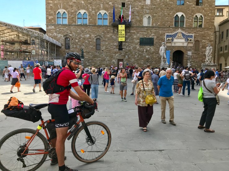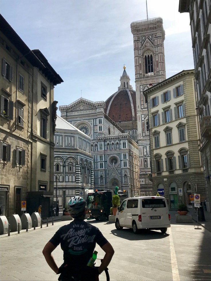 Le deuxième jour commence tranquillement à 6h, la nuit a été bonne, pas de rosé le matin, c’est un bonheur de replier le matos. La descente de la colline de Leonardo s’apparente parfois à du VTT de descente avec des marches rocheuses, mais en prenant le temps, ça passe. Une fois la colline descendu nous serpentons entre les champs avant de rattraper le canal qui nous mènera à Florence. La ville et son dôme se laissent entrevoir puis se présentent à nous en s’approchant doucement. L’arrivée dans Florence est attendu afin d’enfin pouvoir la découvrir, ce sera d’autant plus appréciable car ce sera notre spot de petit-déjeuner.