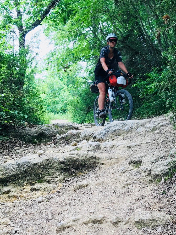 Le parcours était ensuite tout aussi agréable, à parcours les collines de vignes, vergers, oliviers… Des passages à gué sympathiques, quelques marches rocheuses qui faisaient souffler Capu mais elle commençait à prendre de plus en plus de techniques et donc de plaisir quand ça secoue.