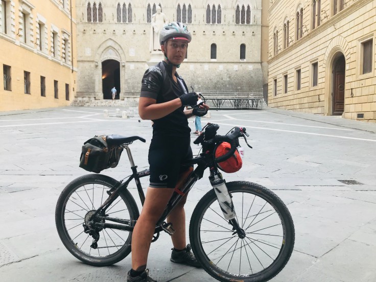 Nous en étions donc à plus de 300 km sur la trace, il nous en restait 250 pour finir et nous étions le 3eme jour, il nous restait donc deux jours pour être dans nos temps. Sienne étant la dernière gare accessible sur la trace, deux choix apparaissaient, soit continuer avec la possibilité de finir en retard, soit en rester là et profiter de Sienne et de remonter tranquillement en faisant du tourisme. Nous avons choisi la deuxième option. C’est jamais évident de décider d’arrêter surtout que, pour ma part, j’avais fait une grosse préparation pour la Malteni et la Gravel Tro Breizh qui avait payé et arrêter n’était pas pour moi une option. Mais comme je l’ai dit quand on fait une épreuve en duo, il faut assumer pour deux et là je ne voulais pas faire subir à Capucine un excès de susceptibilité mal placé et la dégoûter du bikepacking, l’humilité fait aussi partie du sport, c’est parfois difficile mais aussi nécessaire. Rouler doit rester un plaisir, si cela devient une contrainte, il faut savoir se poser les bonnes questions.