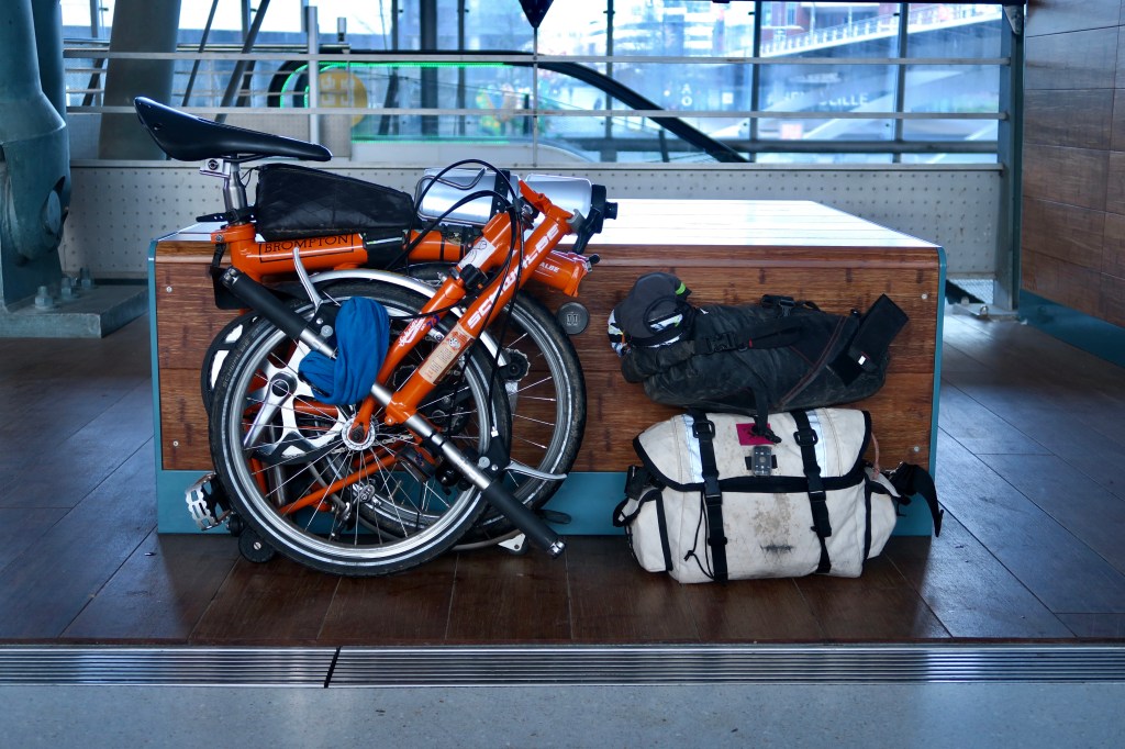 Arrivé à la gare de Lille, je chronomètre le pliage, sacoche avant, food pouch, sacoche arrière, pliage du vélo, en 4 min c’est réglé. Pas besoin de housse, facile à transporter et à ranger dans les espaces bagages, en même temps, c’est fait pour ça et c’est bien agréable.