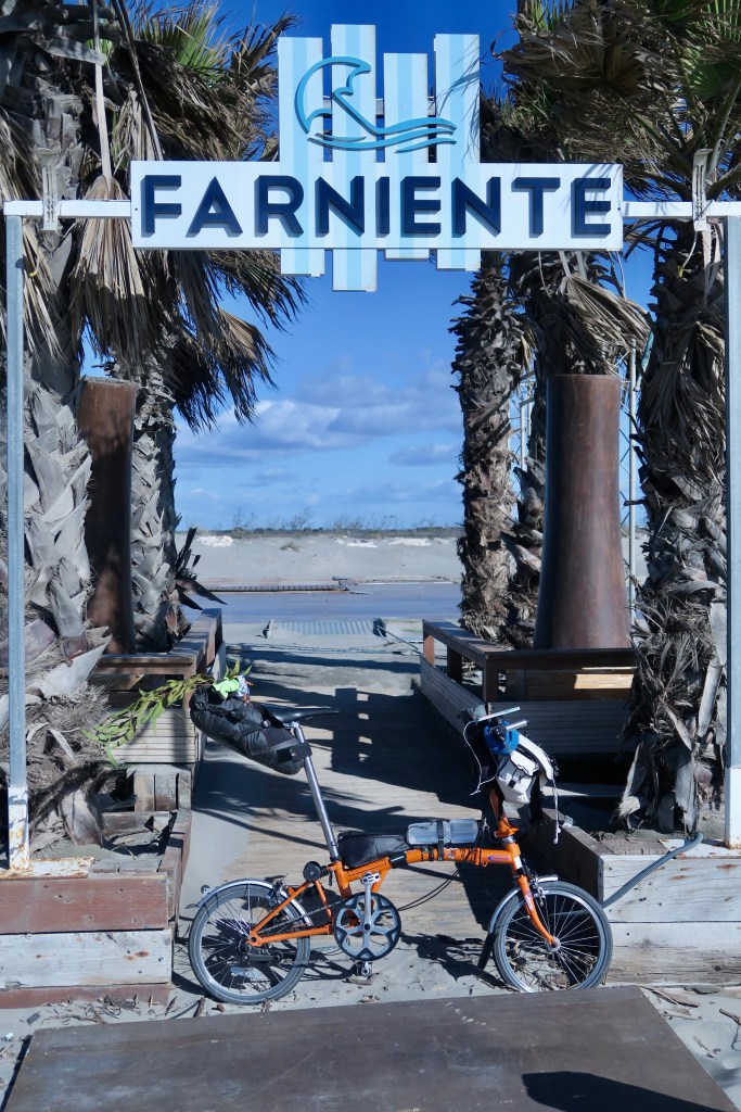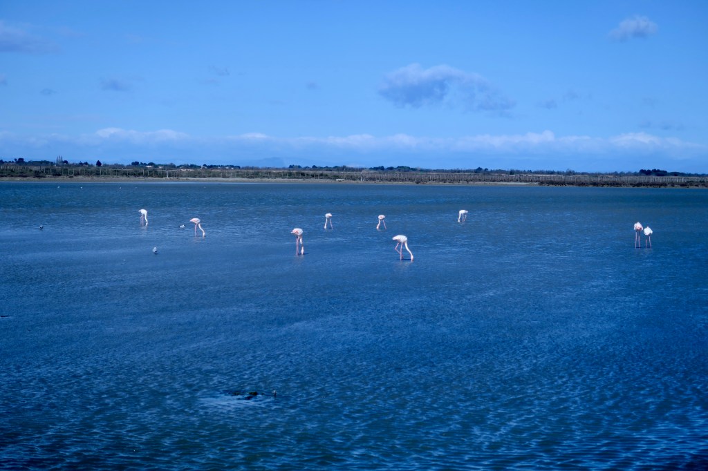 Le vent charrie le sable cinglant les chevilles et remplissant les chaussures. Je repars vers l’est, le vent sera favorable jusque Salin-le-Giraud. La piste qui démarre des Saintes-Maries est assez propre, c’est du gravel mais ça passe bien avec les petites roues. Il y a quelques passages sableux mais rien de trop compliqué non plus. La traversée par le chemin de la Digue à la mer est vraiment sympa, je le recommande. J’ai même croisé les flamands roses encore un emblème de la Camargue.
