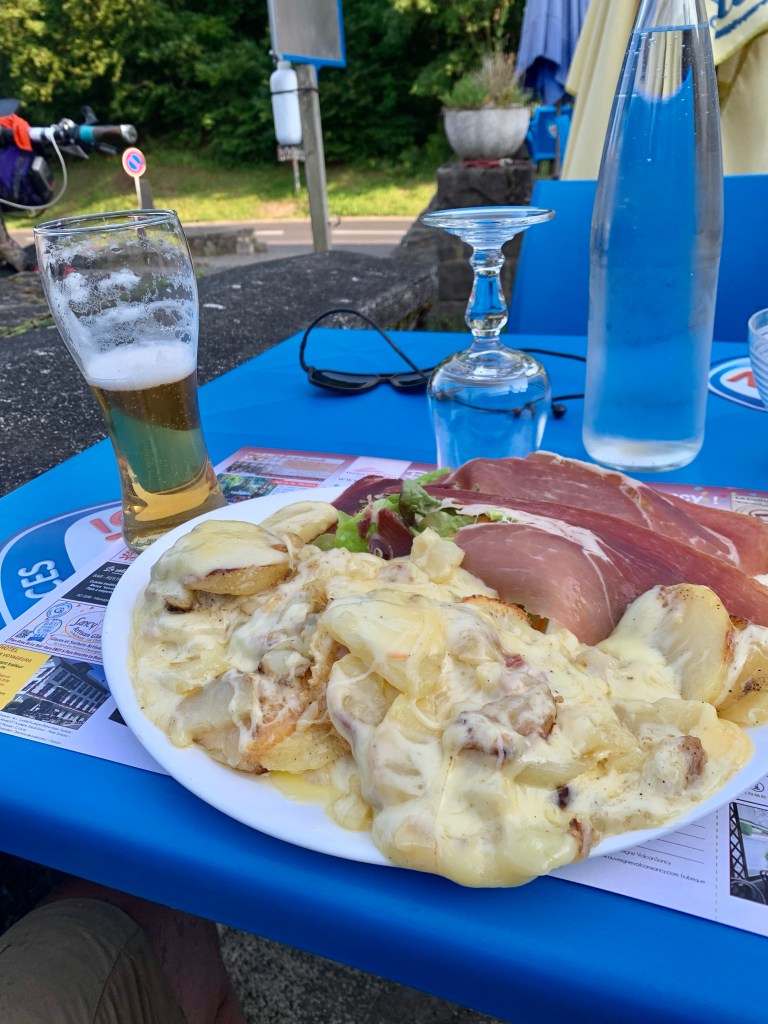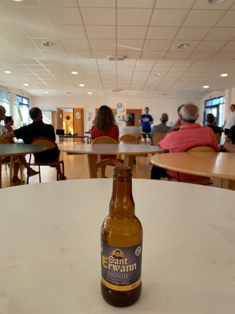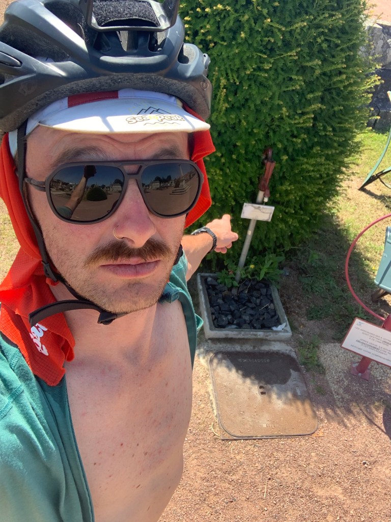 Entre deux bières, je buvais un peu d’eau, très peu 😉 Pour l’eau, globalement il y avait de l’eau régulièrement voir très régulièrement, et en dehors des plaines et la visite des cimetières, dans les massifs montagneux, il y a souvent des fontaines potables. J’avais 2 litres d’eau sur le vélo mais j’ai rajouté un bidon à Poitiers pour pouvoir transporter des boissons sucrées qui font aussi du bien en route. Les 2 litres d’eau sont pour moi un minimum pour avoir l’esprit tranquille, sachant qu’on consomme, en moyenne 50 cl par heure, cela laisse 4h d’autonomie plus 2h avec mon bidon supplémentaire, ce n’est pas déconnant sur des journées de 12h de vélo. Je peux ravitailler deux fois par jour et rouler l’esprit libre, même si je peux bien sûr ravitailler plus souvent, cela me permet de minimiser les pauses et d’être plus régulier. Lors des journées de grosses chaleurs, je m’arrêtais un peu plus souvent sur les points d’eau, mais c’était surtout pour me rafraîchir et faire baisser la température. Être contraint de m’arrêter juste pour un manque d’eau me dérange, donc j’évite.