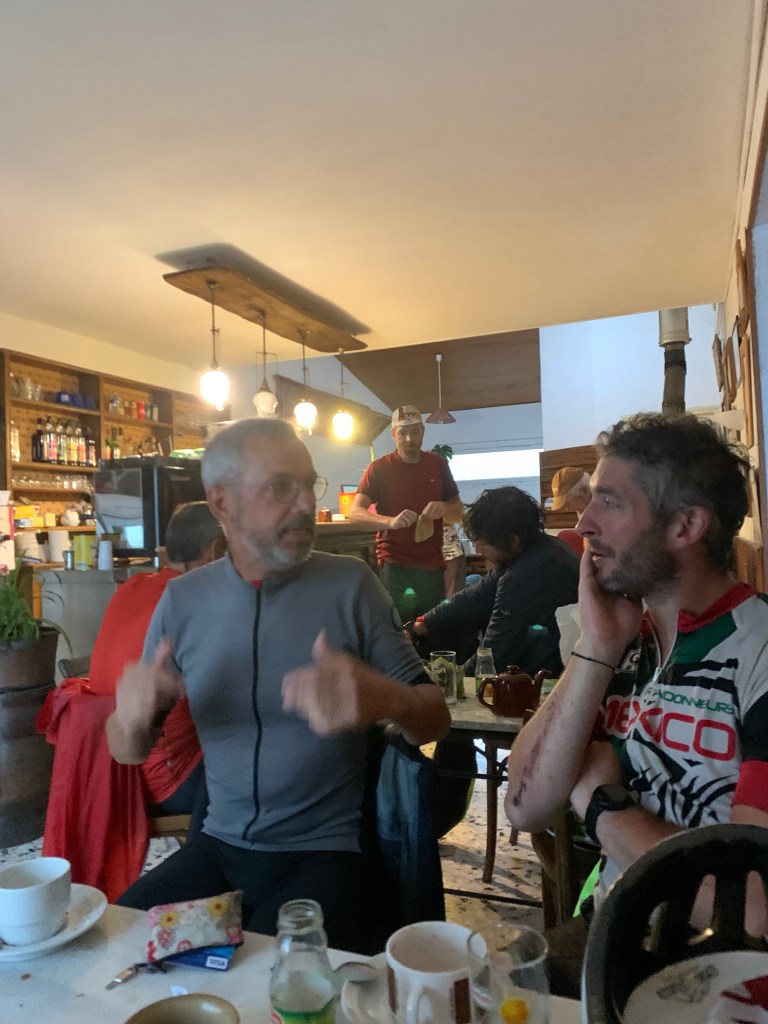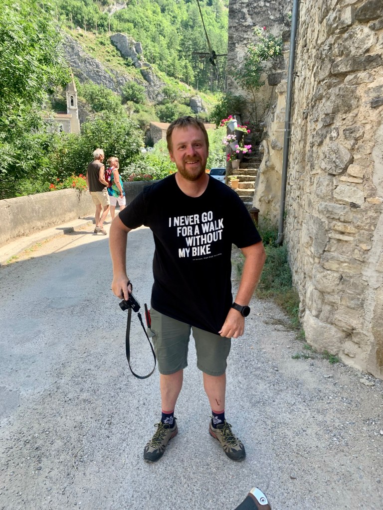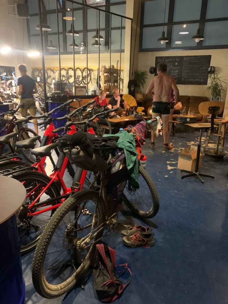 Après 18 mois de galère, j’ai autre chose à faire que de subir la pression des autres, j’ai donc abordé cette épreuve avec philosophie dans l’espoir de finir tout en ayant profité des paysages, des spécialités locales et des rencontres sur le parcours. J’ai été servi. Alors oui, comme je l’ai déjà entendu, si vraiment je veux être tranquille, je peux rouler seul dans mon coin. Je le fais, souvent, je pars régulièrement quelques semaines seul chaque année et je ne sais combien de week-end. Mais participer à une épreuve est aussi pour moi l’occasion de rouler avec du monde sur un tracé que je n’ai pas fait. Rouler seul c’est bien, cela peut-être plaisant et même thérapeutique, mais partager c’est pas mal aussi. Je vis seul et je travaille seul, je vois du monde dans mes sorties et es loisirs, donc là c’est pour moi l’occasion de faire des rencontres, de partager un bout de chemin pendant quelques heures ou quelques minutes. Bien sûr nous ne pouvons pas nous entendre avec tout le monde, il y a des affinités plus ou moins marquées. Et au delà des relations humaines, il y a aussi le rythme de roulage. En ultra, chacun.e roule à son rythme, s’arrête ou il/elle veut et le temps qu’il/elle veut. Parfois nous pouvons partager quelques minutes sur les chemins ou en pause et parfois se croiser, rouler ensemble et s’éloigner, se retrouver sur plusieurs jours. Du fait de n’avoir qu’une vitesse, j’ai un rythme qui m’est imposé, si je veux rouler moins vite pour rester avec quelqu’un moins rapide ou en montée, je ne peux pas changer de vitesse et je vais devoir forcer, et à l’inverse pour rouler avec une personne plus rapide ou dans une zone plu roulante je vais surmouliner et ce n’est pas l’idéal non plus. Donc durant les 8 premiers jours, j’ai roulé majoritairement seul. J’ai croisé pas mal de monde le premier jour et avec Fred Paulet de Cévenavélo et nous nous sommes souvent retrouvés jusqu’au 4e jour. J’ai un peu roulé avec Arnaud aussi et avec Antoine Fuf qui s’est mis à mon rythme durant une demi-journée, ce qui était assez sympa. Vu mon rythme des deux premiers jours, si j’avais continué comme ça, je serais resté seul et je ne l’aurais pas vécu de la même façon. J’ai ralenti ensuite pour me mettre dans le peloton, profiter et je ne l’ai pas regretté.