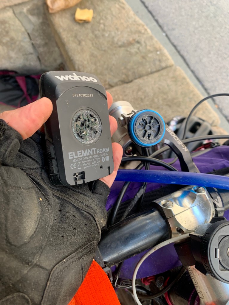 Malgré l’expérience, ma gestion électrique a été catastrophique, je termine avec toutes mes batteries à plat sans possibilité de recharger. J’ai fait l’erreur de partir avec des connectiques usagées et je l’ai payé. Sur la liste des choses à acheter avant de partir il y avait en tête des nouveaux câbles pour la batterie et le téléphone mais je me suis dit « mooooh ça passe », erreur. J’avais deux câbles microUSB et un d’Iphone, j’ai un câble microUSB qui a lâché en route et le câble de téléphone avait une mauvaise connexion, sans parler de ma batterie externe qui marche très bien mais les connectiques ayant pris du jeu, en roulant cela chargeait à moitié au début puis plus du tout le dernier jour. Donc au bout d’un moment, le téléphone ne pouvait être chargé qu’aux pauses, la batterie que sur secteur et le GPS que quand la batterie n’était pas en charge… J’arrive à terminer avec tous mes appareils, mais mon GPS s’éteindra juste après l’arrivée, avec la batterie à plat et le téléphone dans ses dernières heures. Il ne fallait pas une journée de plus. C’est à mieux gérer pour les prochaines aventures.