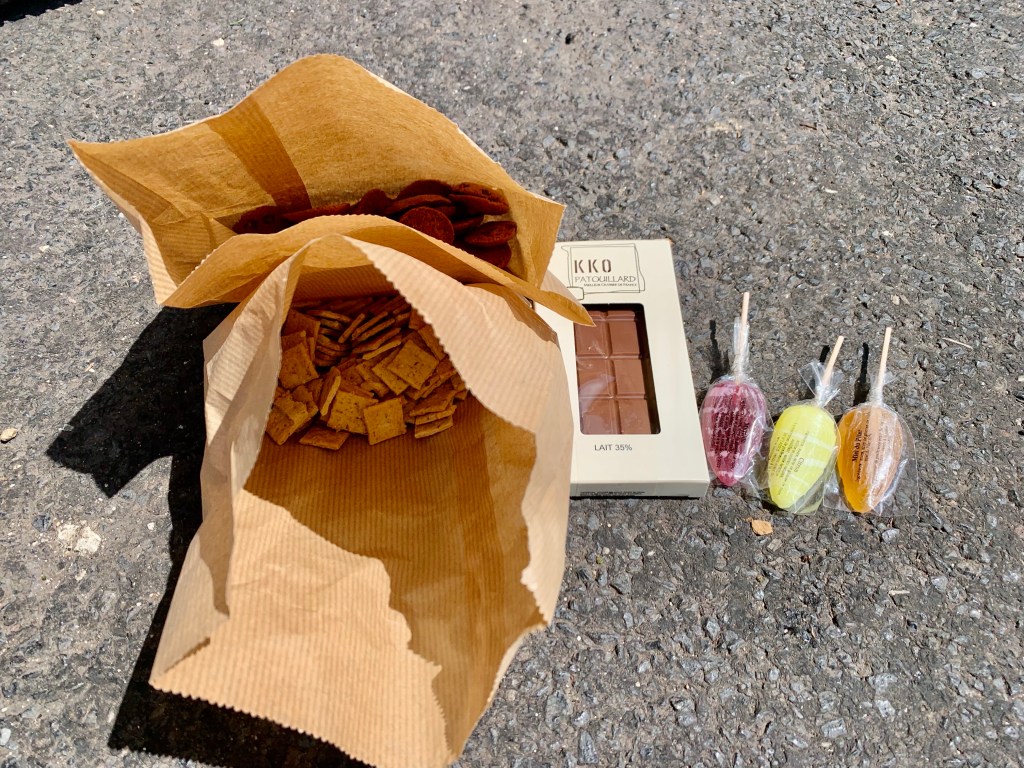 Cela s’organisait de la sorte, le matin je mangeais un fruit et 50 cl de jus de fruits, 1h30 après je mangeais des biscuits ou barres de céréales. Dans la matinée, en fonction des ravitos, je prenais un petit-déjeuner café-jus de fruits-viennoiseries et je prévoyais pour mon repas du midi (sandwich-soda-dessert pour plus tard) si pas de ravito le midi. Dans l’après-midi, je remangeais un fruit, puis mon dessert. En milieu d’après-midi, ravitaillement, thé glacé, diabolo, fruits…Il faisait souvent chaud et les fruits étaient bienvenus. Au même moment, je commençais à regarder pour le lendemain matin (fruits, jus de fruit, biscuits) et la pause du soir si il y avait un resto qui tombait entre 19 et 21h, si non je prévoyais pour le diner et de quoi grignoter au bivouac et rebelote.