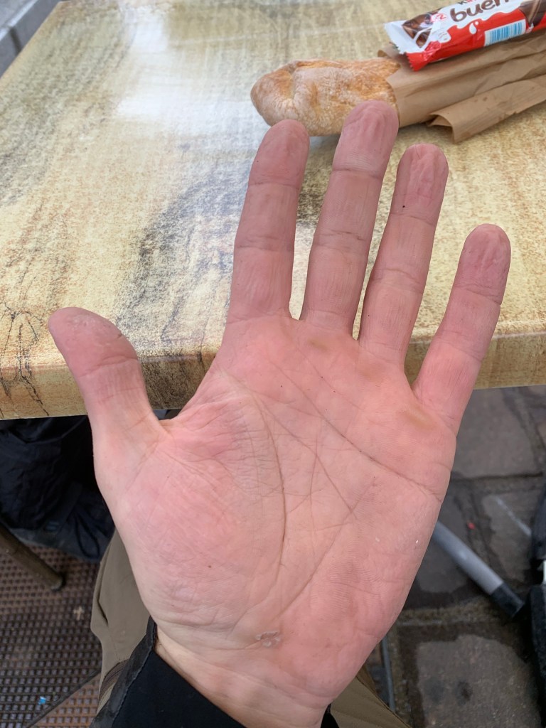 Pour les autres points de contacts qui peuvent poser problème, il y a les mains et les pieds. Les pieds ont surtout souffert de l’humidité, les Fizik sont excellentes pour rouler et marcher, j’ai une bonne transmission de puissance dans un cas et je ne sens pas la cale dans l’autre. Le seul défaut et qu’une fois que l’eau rentre, elle sèche difficilement. En les séchant bien aux pauses et la nuit, c’est gérable pour éviter les pieds d’athlète qui donnent des sensations de brûlure. Pour les mains, bien que je n’ai plus de problème depuis 2018, j’ai été trop confiant en partant avec une poignée et un Spirgrip mal réglé. Au bout de deux jours, j’avais une grosse compression du nerf ulnaire… Après des réglages et l’achat de nouvelles mitaines à la Cyclerie, c’était mieux, au fil des jours en faisant des étirements sur le vélo, j’avais déjà retrouvé des sensations. C’est un problème très désagréable qui touche le petit doigt et l’annulaire et qui peut avoir des conséquences à long terme.