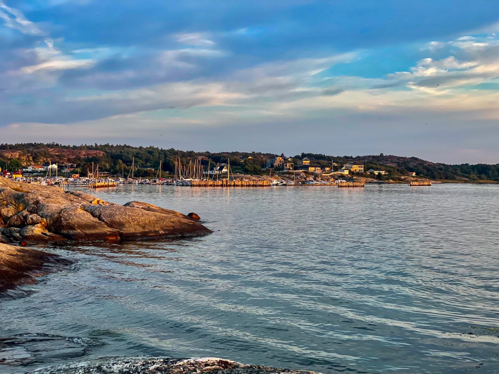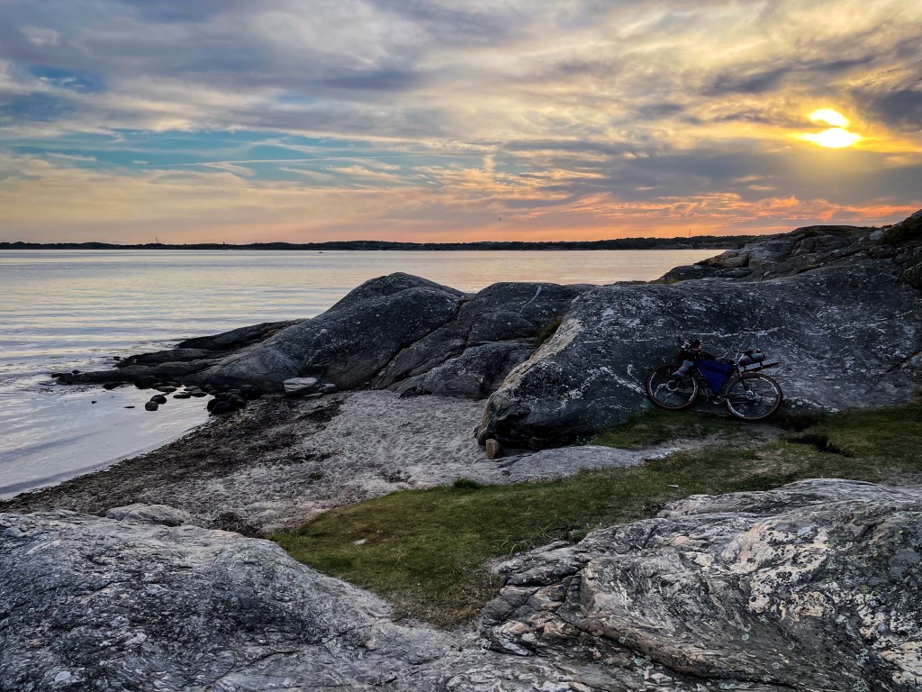 Une fois à Göteborg, je quitte rapidement le centre vers la côte pour trouver un spot de bivouac. Le littoral est très touristique, les campings sont pleins et les plages bondées. Je sors des sentiers et avancent entre le rochers avec le vélo à la main pour trouver le spot du soir. Je tombe sur une petite plage nichée entre les rochers face à un port de plaisance. Juste assez proche pour profiter de la vue et juste assez loin pour être tranquille. Je me pose, je fais un peu trempette et je profite de la douceur de la soirée, tout est agréable et je me réjouis aussi que ce soit la dernière soirée avec des bières allégées en alcool, le Danemark n’est pas loin et la bière est dans leur culture…
