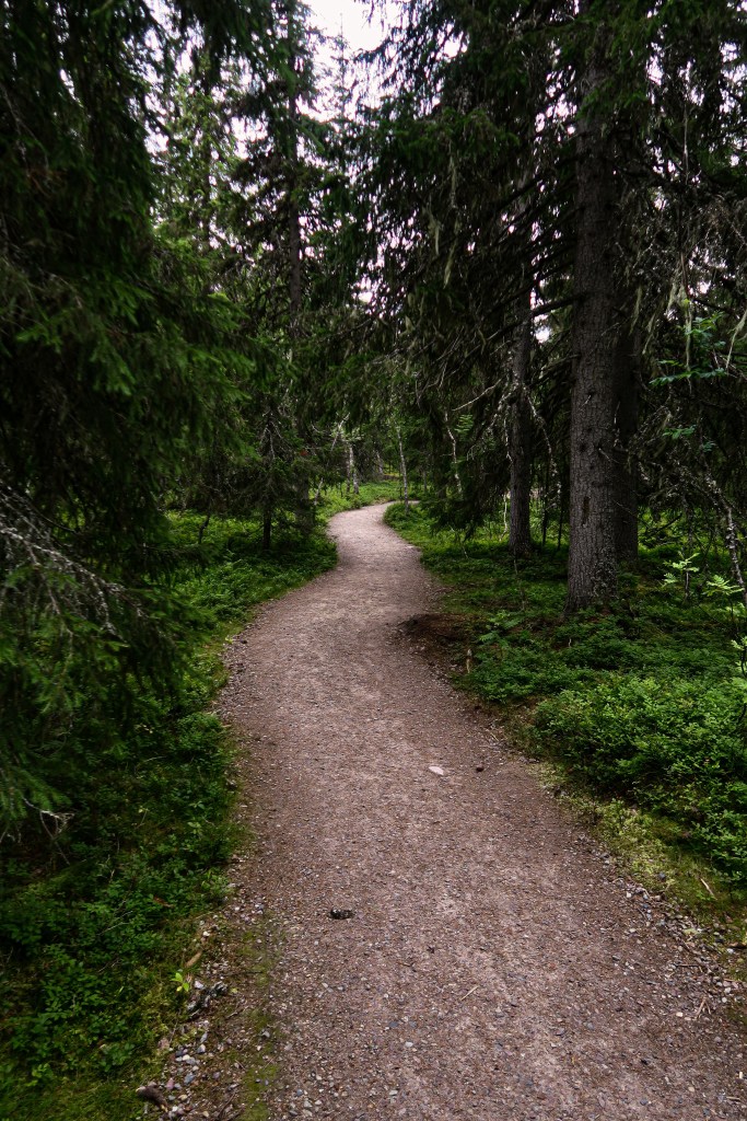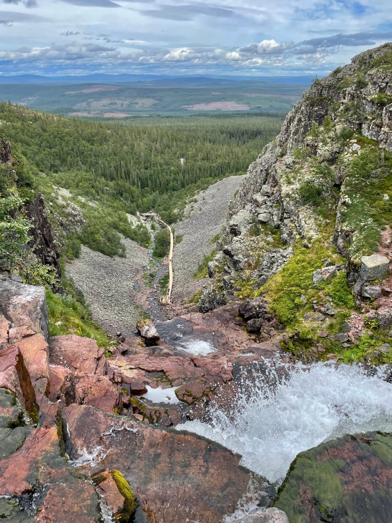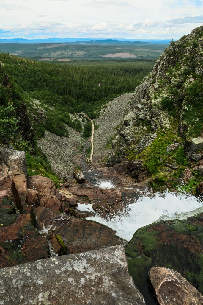La randonnée est plaisante entre les arbres et les marais. À l’approche de la cascade il y a un peu plus de monde mais les chemins sont bien aménagés, la dernière partie se fait entre les rochers, mais la cascade en vaut la peine. Avec ses 93 m, la chute est impressionnante et rafraîchissante, même si la chaleur n’est pas le problème du parc. C’est un des zones au climat le plus continental de la Scandinavie, la température moyenne à l’année est de 1°C.