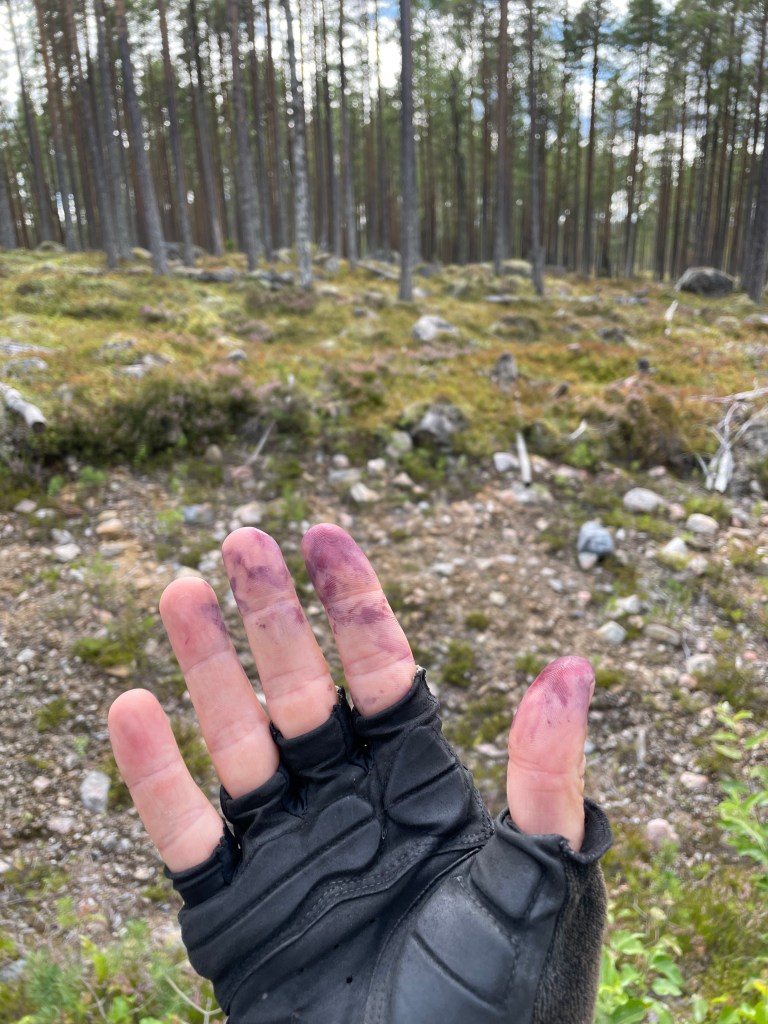 Les forêts sont plus rocheuses, le chemin devient parfois chaotique mais jamais impossible, une marée de myrtilles occupe les sous-bois. J’avais 110 km jusqu’au prochain village, je ne pensais croiser personne. Mais en haut d’une colline, je vois quelques personnes en bordure de forêt en train de cueillir des myrtilles avec un peigne. Ils sont aussi étonnés que moi de les voir et me font comprendre que c’est un coin à myrtille. Ils viennent du Pérou et sont employés pour la cueillette, ils ont des sceaux remplis de myrtilles qu’ils entassent dans leur camionnette. J’avoue que ce sera le meilleur spot que j’ai vus, les myrtilles sont abondantes et bien charnues.