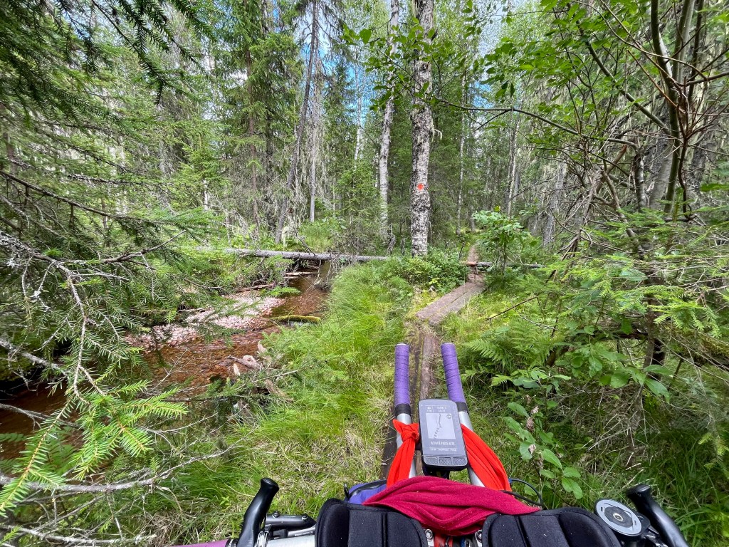 En selle, je redescend du parc et rattrape une piste rapidement. En faisant mon parcours il y avait une portion courte qui était indiqué en pédestre. C’est une zone de la partie protégée du parc qui recoupait la piste, le vélo y est interdit, je me dis que je pousserais. Une fois proche de la zone, la piste s’arrête net effectivement, un chemin pédestre lui laisse la place, je pousse, le chemin devient en sentier puis juste une trace dans le marais avec des planche pour marcher, des arbres à passer par dessus, par dessous. Étrangement cela ne me dérange pas, au contraire, ça me change des pistes continues et uniformes.