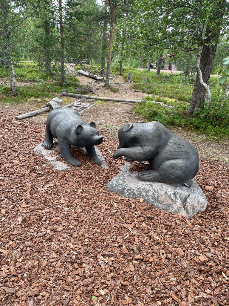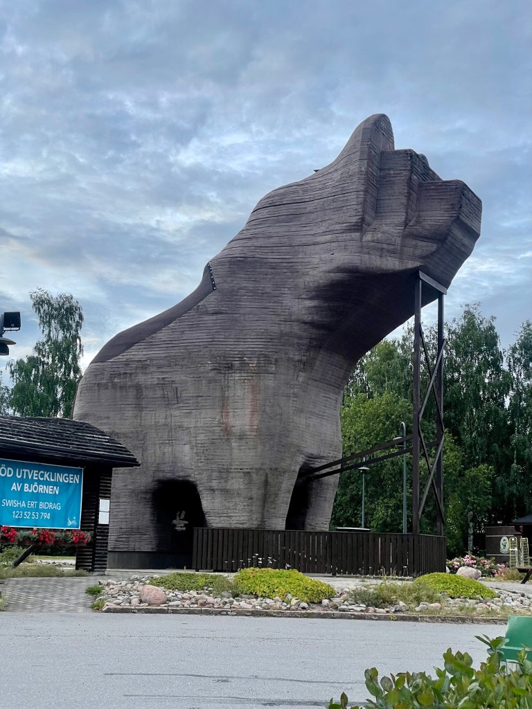 Je rejoins mon point de chute vers 17h30 mais le lieu de bivouac n’est pas à mon goût et il est encore tôt, même si la fatigue commence à se faire sentir. Je décide de pousser jusqu’à la prochaine ville par la route pour prendre une douche et dormir. Les 50 km qu’il reste auront raison de moi. Après une grosse première journée en Suède, une nuit courte et une autre grosse journée j’arriverai sur les rotules à Sveg, accueilli par son célèbre ours en bois qui me rappelle que je suis dans la zone la plus dense en ours de Scandinavie et que je dois m’adapter.