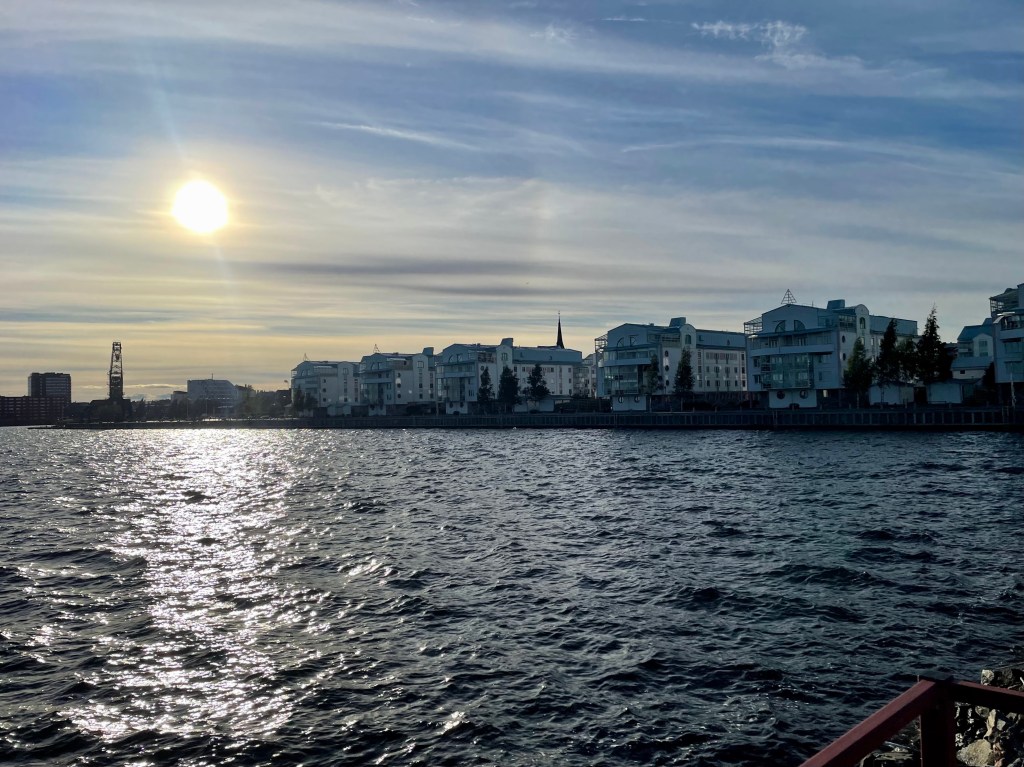 L’après-midi sera toute aussi forestière avec plus de route et juste une ville pour le goûter. Je ne traînerai pas de la journée et avant l’arrivée, je n’aurais pas vu une seule fois la mer. Les heures défilent au rythme de la lecture audio, je commence à faire connaissance avec le Comte. L’itinéraire est contemplatif, certains diront ennuyeux, je commence à m’y faire en réalité. J’arriverai en fin d’après-midi à Luleå, face à la Baltique, enfin, et ses eaux sombres sous un soleil encore haut pour cette heure.