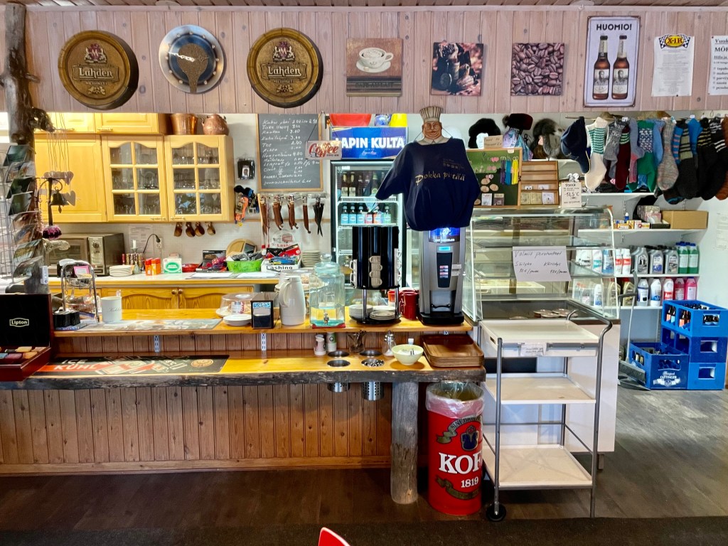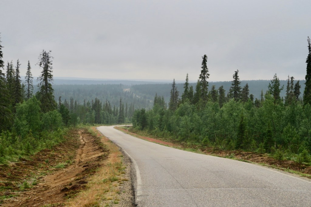 Je me rappelle peu de la matinée, je sais seulement que c’était beau, la forêt, croiser les rennes, apercevoir un élan, puis c’était long. De la route continue, je sors la musique rapidement. Je mangerais sur un parking sans m’asseoir assailli par les moustiques, la pluie arrive ensuite, je m’arrête plus tard à Kittila, seul village croisé après 80 km, réputé comme étant l’endroit le plus froid de Finlande. Je ne sais pas si cela à un lien, mais c’est le seul moment du voyage ou je serais aussi couvert et le seul où je mettrais la veste de pluie et les gants. Il y a quelques habitations et un baari, j’entre et m’adresse à la gérante en anglais, elle appelle son mari et s’en va. Lui, un vieux Sami, le regard doux et malin m’interroge, je lui dis que j’ai froid et faim, il me donne un mug en me désignant la cafetière du menton et me demande « Sweet or Salty », je répond sweet et il me sort un énorme beignet à la myrtille. Je suis refait. Je n’ose pas lui demander de le prendre en photo, il collait parfaitement avec son baari. L’endroit est hétéroclite, la déco chargé, ils vendent de l’huile moteur, des chaussettes et des couteaux. Il fait chaud, les chaises sont limées par le passage des voyageurs, je savoure l’instant, j’y resterais 45 min. Il n’y a rien à 80 km à la ronde, c’est un véritable oasis nordique. Mais il faut se remettre en route, la pluie continue, il est 15h30 et la prochaine ville est à 140 km, je ne veux pas m’arrêter trempé en bivouac ce soir. En m’écartant un peu, je peux aller jusque la station de Sirrka, ce sera mon point de chute du soir, il reste donc 100 km.