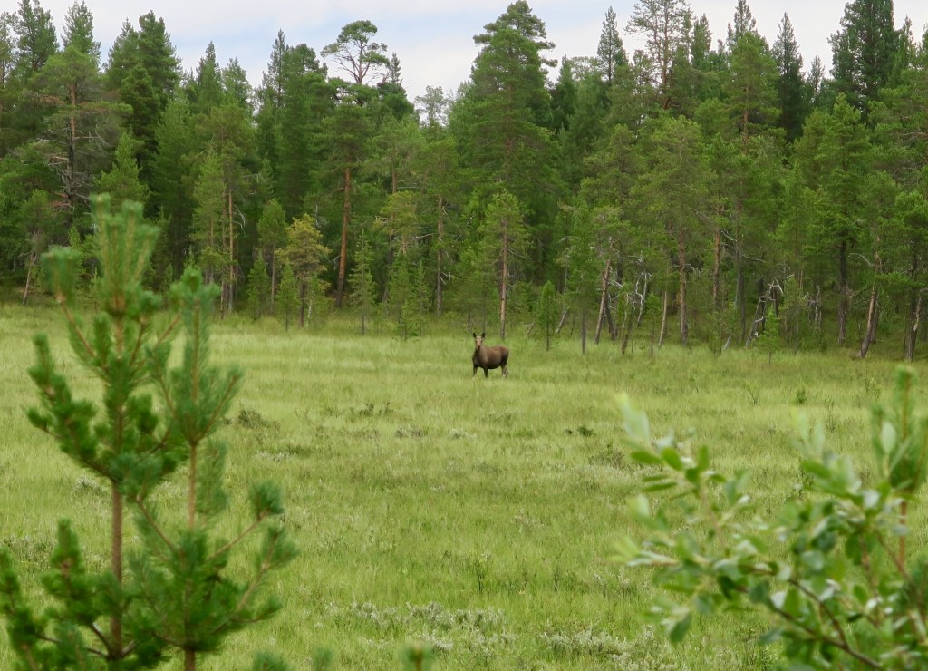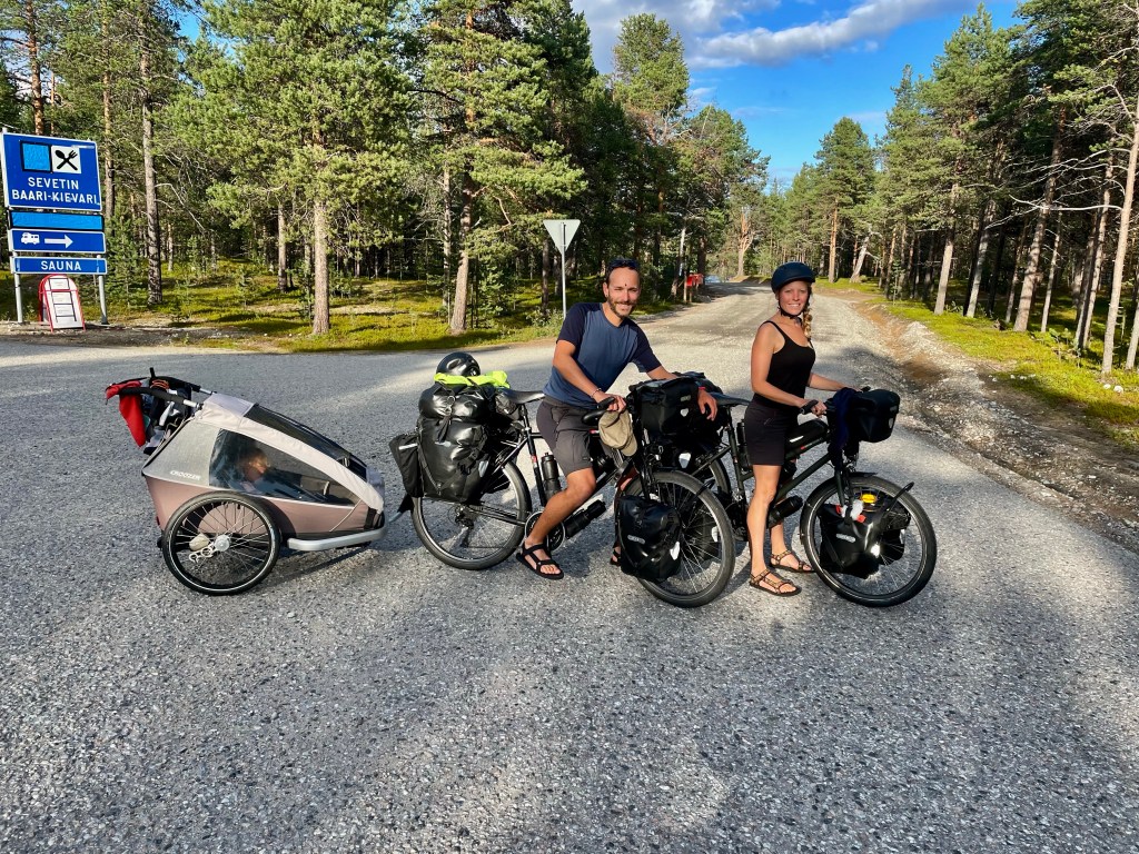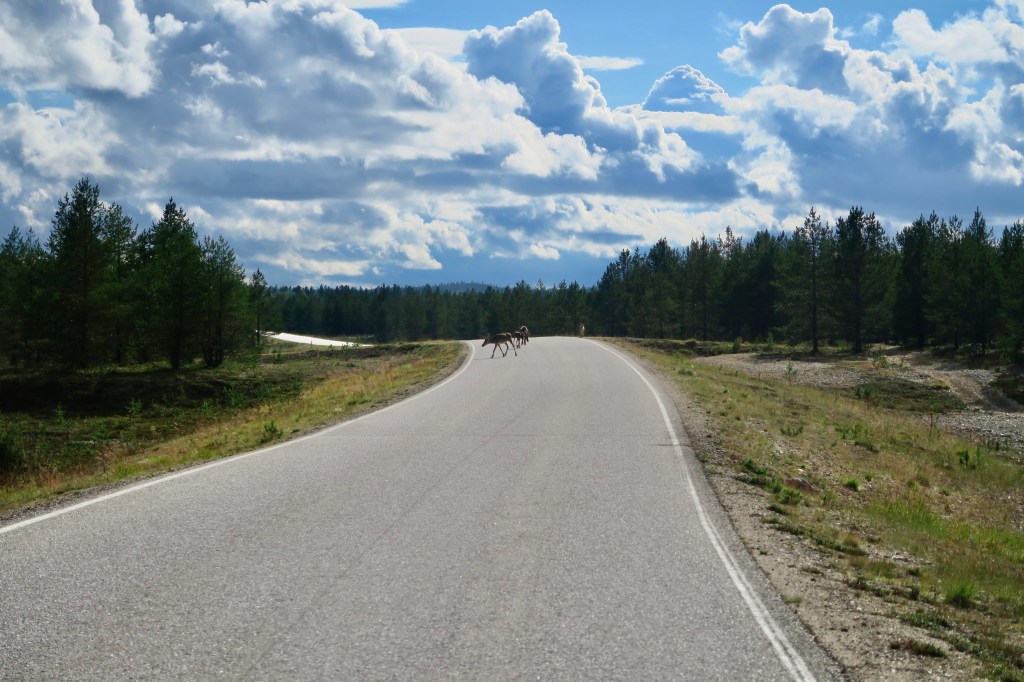 En roulant et discutant, je sens que j’ai plus en plus de mal à suivre et que je m’essouffle vite, la distraction de la compagnie m’a fait oublié de manger depuis le midi et je sens la fringale arriver. Je refais le plein avant la faute. Il fait beau dans cet après-midi estivo-boréale, le relief est assez mou mais les forêts sont belles et propres, elles sont entrecoupées de marais et de lacs. Hormis la route, il n’y a pas trop d’occupation humaine depuis la Norvège, quelques rennes se font surprendre parfois par notre présence et les voitures se comptent sur les doigts d’une main. Notre petit groupe avance bon train, avec mon unique vitesse je prend de l’avance dans les montées et Jimmy en prend dans les descentes poussé par la remorque. Le premier village approche, c’était mon point de chute pour manger le soir. Jimmy et Audrey me disent qu’ils vont pousser un peu, leur budget ne leur permet pas le resto, leur compagnie était sympathique. Etant donné qu’il n’y a qu’une seule route, je me dis que je les croiserais le lendemain.