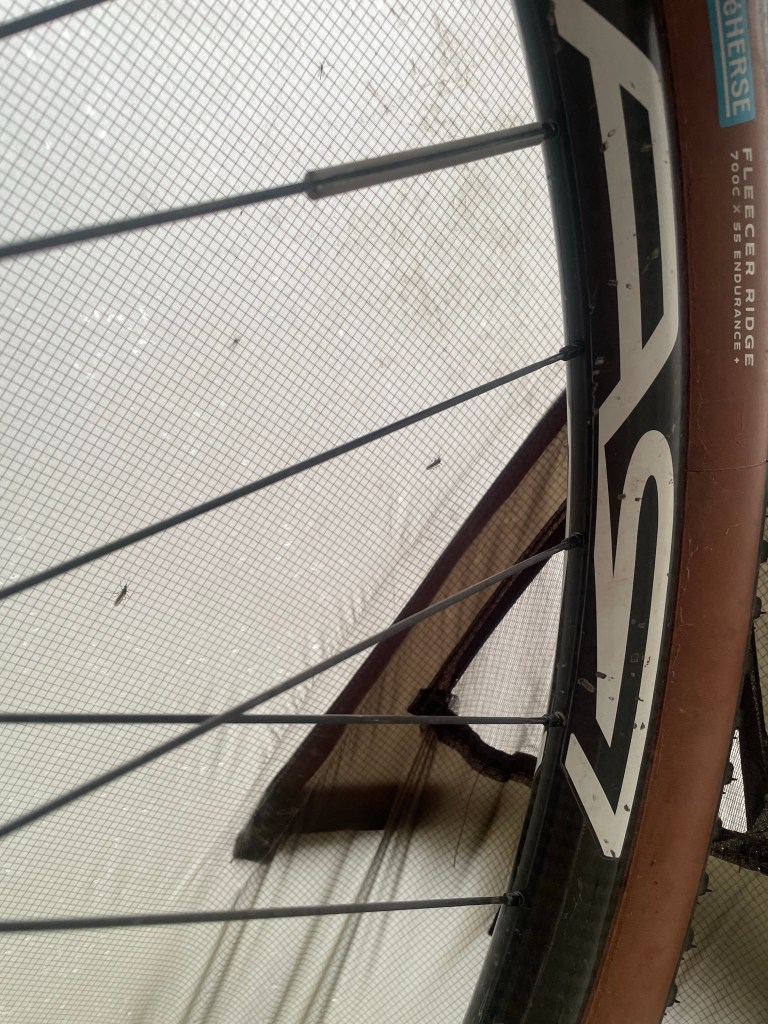 La pluie se reforme le temps que je trouve un supermarché, depuis la veille j’ai retrouvé l’euros, ça fera moins en taxes. C’est mon moment de tourisme où je vais découvrir les spécialités locales comme les rayons de sauce, sauces au fromage, à la charcuterie, à la crevette, normal. Il y a aussi beaucoup de salamis différents, de multiples versions d’une espèce de gouda et du pain noir, ce sera parfait pour ces journées d’autonomie. Je refais le plein, la prochaine ville est dans 240 km. Cornichons, fromage, soda, yaourt à boire, un bon goûter. J’échange avec un autre cycliste qui est vélo de route, il me demande si je fais l’European Divide, apparamment l’itinéraire est assez connu. Une fois la pluie passée, je file vers le camping au bord du lac, bonne nouvelle, il n’y a pas de moustique et un sauna sur remorque, c’est bien la Finlande. L’accueil est excellent, le campement s’installe et je me pose un peu avant d’aller manger. Je suis rincé au sens propre et au figuré. Je fais sécher mes chaussures et mes chaussettes comme je peux et j’enfile mes sandales sur mes chaussettes étanche, elles feront le job.