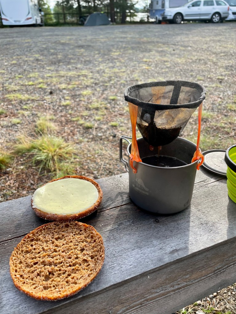Réveillé sans réveil, entre 8h et 12h selon la journée de la veille, je prends le temps de remballer puis vient le petit déjeuner ou l’inverse si la tente est mouillée. Au petit déjeuner, pain noir, beurre de cacahuètes ou pâte à tartiner à l’amande (une tuerie), fromage, jus de fruit, fruit, café et basta.
