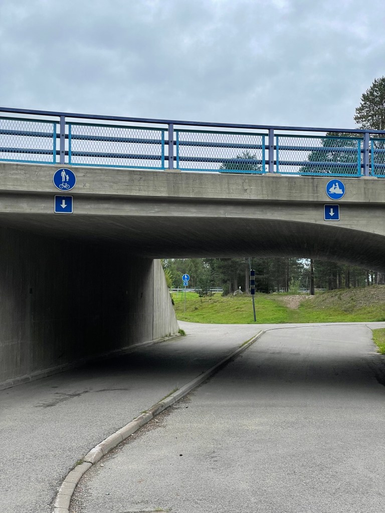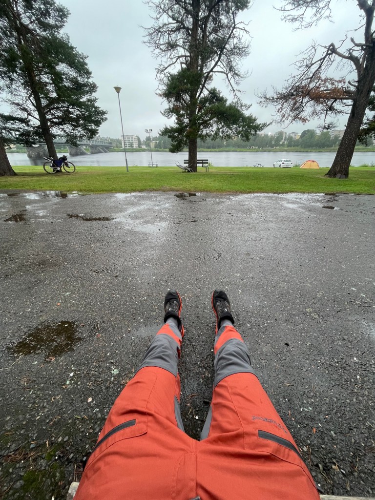 Les portiques à vélo sont faits pour les Fatbike, avec mes 2.25 c’est un peu ridicule. Après avoir exploré quelques magasins, je trouve mon bonheur avec un pantalon de rando orange, je suis à la mode scandinave, faut le voir porté quoi. Il n’est pas indispensable mais avec les moustiques, c’est d’un grand confort et il faut dire que le week-end est frais. La suite de la journée sera une tentative de rallier Rovaniemi par la route, mais l’averse et la Nationale fréquentée auront raison de ma patience. C’est le week-end aussi, je me jèterais dans le premier bus qui me fera traverser sans m’en rendre le cercle polaire, j’aurais bien voulu le voir, au moins pour la forme, il est à quelques kilomètres de la ville, j’aurais peut-être le temps le lendemain.