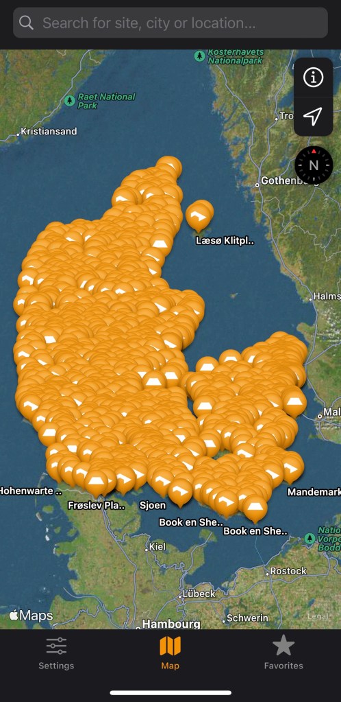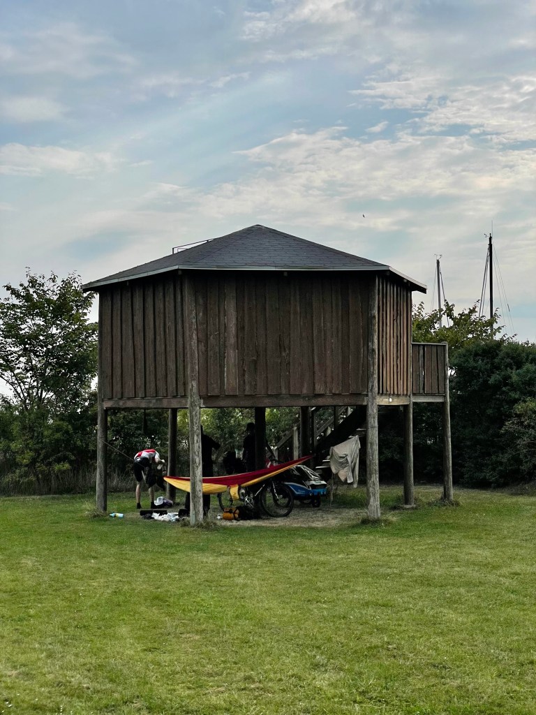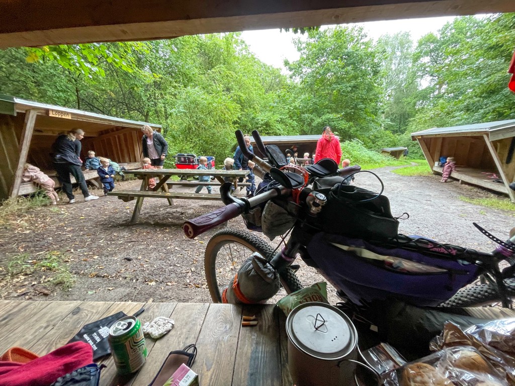 Une fois ravitaillé, je me suis orienté vers le shelter au Nord la ville devant le port de plaisance. Les shelters sont une spécialité danoises, ce sont des abris pour accueillir les voyageurs. Certains sont sommaires avec juste un abri bas fermé sur trois côtés avec un plancher pour dormir et où ne tient pas debout. D’autres sont plus élaborés avec plusieurs chambres. Il peut y avoir de l’eau et des toilettes à proximité et souvent une place à feu avec une hache pour couper du bois et refaire le plein pour les voyageurs suivants. Une appli les référence tous, ils sont gratuits et il y en a vraiment partout. De plus les campings sont nombreux et pas chers avec des bonnes surprises, cela change des campings hors de prix en Suède.