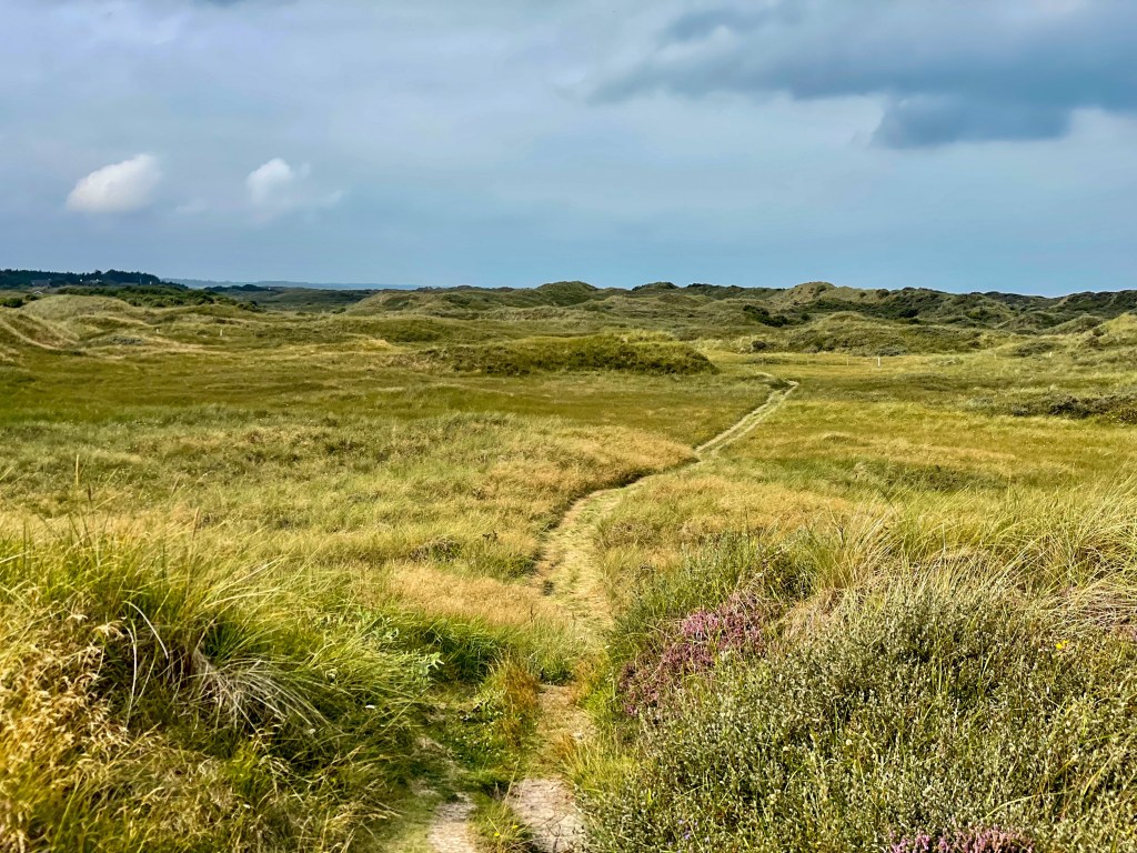 Les paysages sont assez plats mais il y a un bon réseau de chemins, les deux premiers jours je parcourais la lande et les dunes de la côte Ouest côté Mer du Nord. Les paysages sont vraiment grandioses, les dunes sont perchées sur des falaises ce qui leur donnent de l’envergure avec des accès à la plage avec de quelques centaines de marches. L’arrière pays et un patchwork de campagne et de forêts avec des passages sableux mais souvent roulants. C’est moins rectiligne que précédemment, souvent ludique et je me perds une fois dans le réseau de chemins. les stations balnéaires s’enchaînent et je croise un nombre conséquent de petites maisons en bois noir avec des fenêtres blanches réparties régulièrement le long de la côte, quand elles sont occupées, elles arborent un drapeau danois.