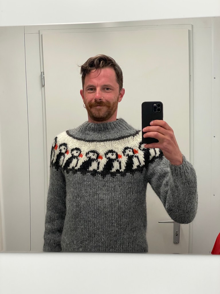 Je vous avez laissé après Reykjavik où après un tour rapide rapide de la capitale j’ai pu trouver un original pull islandais, un lopi, mais pas n’importe lequel, dès que je l’ai vu, j’ai su qu’il repartirait avec moi. Avec un collier de macareux, je n’ai pas résisté. C’est simple, ayant un budget limité, j’avais alloué une somme pour me faire plaisir, j’ai dû la doubler pour cette petite folie. Je ferais l’impasse sur les restos, mais au moins j’aurais chaud, car semblant de rien, il l’a bien servi. Après des températures estivales, avec 24° quand même, le vent du Nord s’y est mêlé et le mercure est difficilement monté au dessus des 10° sur cette deuxième partie. J’ai mieux compris pourquoi les pulls étaient si populaires, ils sont indispensables ici.