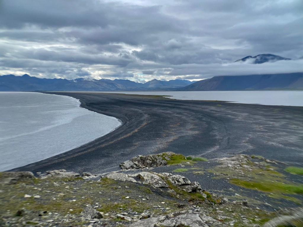 De retour sur la côte, le réseau se simplifie, une fois le fameux Eyjafjallajökull passé, le littoral d’abord en mince bande s’élargit ensuite et fait place aux plaines littorales du sud battues par les vents. D’abord disposées en coulées de laves ancestrales recouvertes de mousses épaisses, elles passent ensuite aux plaines glaciaires d’un gris se confondant avec la route.